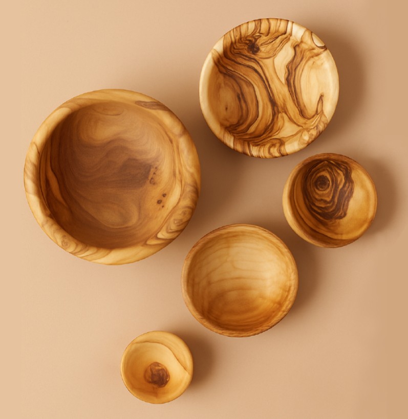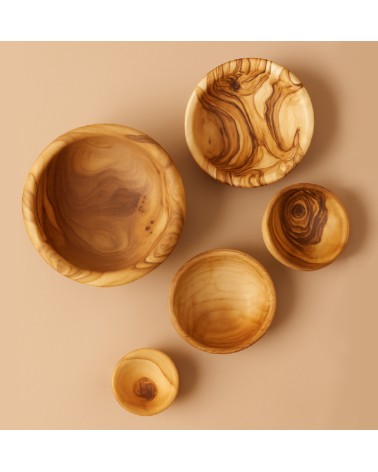 Five perfectly sized bowls that fit neatly inside one another. Ideal for prep, serving, or display. Each piece reveals the unique grain and tone of olive wood.
